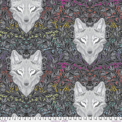 Graywork is a follow up to Tula Pink's black and white collection titled "Linework" from 2020. This is a neutral collection designed in various shades of gray to fill the spaces between the rainbows. Graywork began as a collection of all gray prints and slowly blossomed to include touches of color to spice things up. I find it impossible to leave something completely void of color. For the main prints of the collection I focused on animals that live their lives in shades of gray; Wolves, Bears, Snow Leopards, Puffins and Sea Lions. These eight prints are big and illustrative, packed with details designed for fussy cutting as the stars of the show. The coordinating prints are variations on existing True Colors prints with some new pieces for texture. M