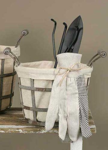 This canvas-covered basket is sturdy and constructed from strips of metal finished in a textured grey. It measures 9.5" diameter and 9" tall to the handles. Canvas liner is easily removable for cleaning. Accessories are not included.