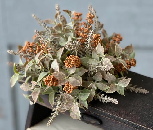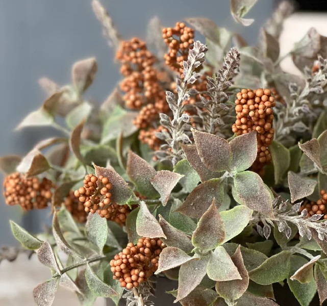 A collection with a crisp and cool feel made up of spires of bubble berries and lavender-like shoots tucked into leaves with a felted effect.