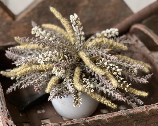 A neutral collection full of texture and charm. Sprays of tiny bubble berries mixed with lavender like spires.
