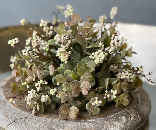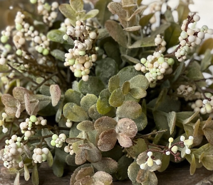 A gorgeous melody of lightly flocked eucalyptus greenery dashed with branching accents topped with bubble berry clusters and small orb-like buds.