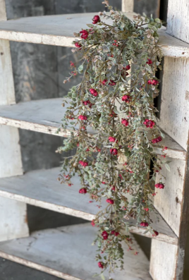 This collection features small, colorful rosettes peppered throughout a bed of mixed, lightly-powdered greenery with small berry-like orbs.