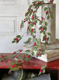A true holiday classic, the holly with berries is a well loved favorite sure to bring a dash of festivity to displays. Scalloped holly leaves are punctuated with cheerful red berries and topped with sheen of iridescent glitter for extra appeal. The hanging features wire vines that are extremely easy to work with and style.
