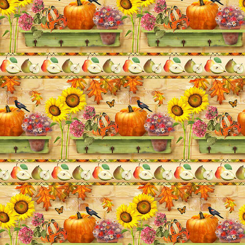 "Autumn Splendor" is designed by Robert Giordano for Henry Glass Fabrics. This collection was inspired by the beauty of the annual cascade of autumn leaves. Autumn Splendor is colored in vivid shades of gold, saffron, russet and scarlet. The collection includes a 24-inch farm stand banner panel, a continuous block yardage print, a border stripe, a floral, a tossed allover bird design, a pumpkin print, a rooster scenic, a foliage texture, a small plaid and a wood texture. The collection was designed with project versatility in mind. .