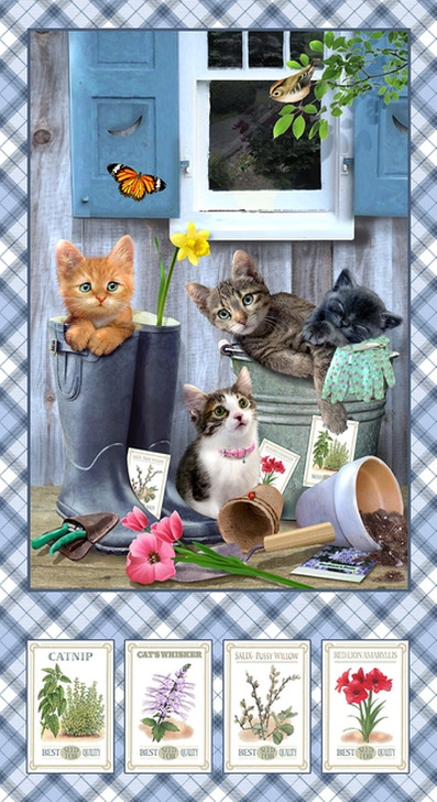 You have to love these sweet little kittens! Kittens in the Garden is the newest fabric collection designed by Robert Giordano/Giordano Studios for Henry Glass Fabrics. Consumers can make a cute wall hanging with the 24-in panel or use the 4 block 36-in panel for pillows, a border, a kitten scenic, a plaid to make placemat or decorate any room. All these prints are coordinated in a sky-blue and neutral color palette.