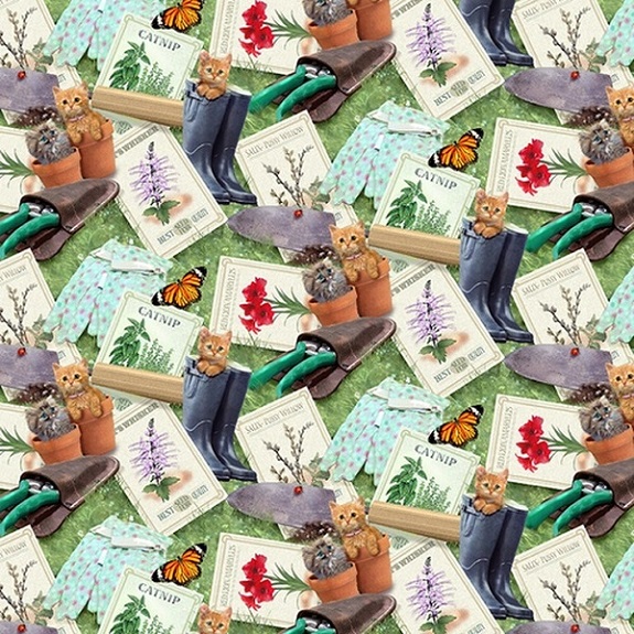 You have to love these sweet little kittens! Kittens in the Garden is the newest fabric collection designed by Robert Giordano/Giordano Studios for Henry Glass Fabrics. Consumers can make a cute wall hanging with the 24-in panel or use the 4 block 36-in panel for pillows, a border, a kitten scenic, a plaid to make placemat or decorate any room. All these prints are coordinated in a sky-blue and neutral color palette.