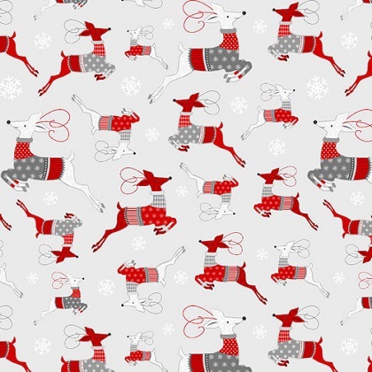 Jan Shade Beach has gone back to her graphic art style on her newest 2-ply flannel line. It was created in her signature color palette of red, gray and white. The block print features winter scenes that showcase a polar bear, reindeer, snowmen, a winter village and a field of trees. The allover designs include tossed polar bears, stacked trees, snowflakes, tossed snowmen, some quiet monotones and a bias plaid for some relief prints.