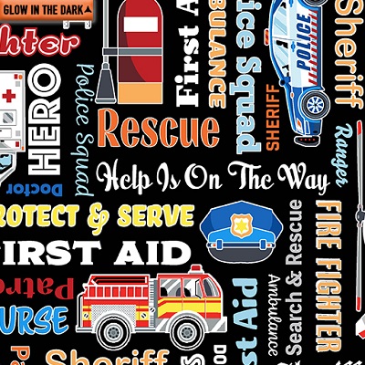 This collection is a great way to honor first responders! These prints represent policemen and policewomen, firefighters, paramedics and EMTs, all those special people who really DO save the day. An added bonus: This fabric is enhanced with Glow in the Dark!
