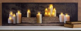 The Mantel of Candles Flickering Light Canvas features 14 glowing candles that will actually light when switched on. The candles have LED lights mounted behind the canvas and they will twinkle and glow on your wall. The battery operated lighting requires 2-AA batteries which are not included. The on/off switch is mounted on the side of the canvas.