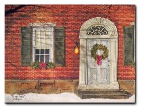 This Radiance Canvas Print features country artwork on stretched canvas, backlit with a flickering LED light for a warm, inviting glow. "Tis The Season" is a lovely print of a winter watercolor scene by folk artist Billy Jacobs, of a red-brick home decorated with pine boughs and holly.