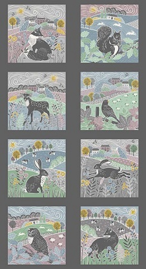 Heather and Sage features a countryside scene in beautiful tones of blues, sage and lavender. The floral and foliage coordinates work well with the panel featuring woodland creatures, a gorgeous collection from Makower UK.