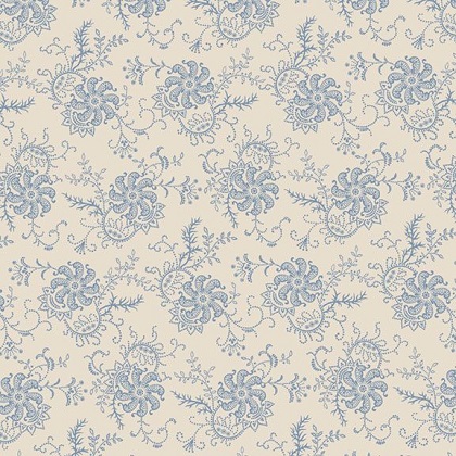 The pretty florals and coordinates in a sophisticated blue-and-cream palette make up the debut collection from Carrie Quinn, inspired by her grandmother. "My grandmother was an amazing woman and a beautiful quilter. Genevieve was her middle name."