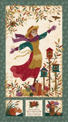 During the first signs of fall, many of our children will leave the nest. Whether that child heads to college, or to the neighborhood pre-school, the home can get so quiet. The inspiration for the Scarecrow's Song panel is about this season of life. Our little birds, that we have sheltered for so long, leave the nest and soar to new heights. The scarecrow's song (printed on the lower portion of her panel) was written by our mother, Carolyn Wooldridge."