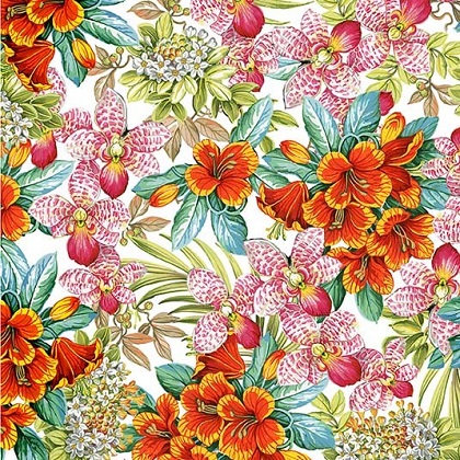Exotica features a stunning, bright color story with a striking panel of parrots and florals. These tropical prints will take you on vacation with jungle foliage & rainforest plants.