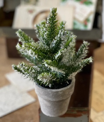 Small gleaming, glittering trees add a punch of wintery delight to any space they occupy. Features heavy snow and glitter.