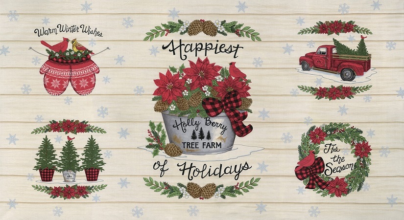 A holiday tradition for many families is to visit a Christmas tree farm to cut their own tree. Deb Strain's newest collection is filled with the scenes you would enjoy on a visit to Holly Berry Tree Farm. Pinecones and berries, evergreen wreaths, poinsettias, snowflakes and the occasional cardinal. Rich reds, piney greens and charcoal black make this the perfect fabric group for you next seasonal project!