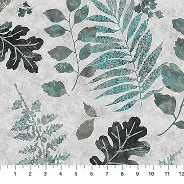 Northcott - Shimmer Luminous - Scattered Leaves, Gray/Turquoise