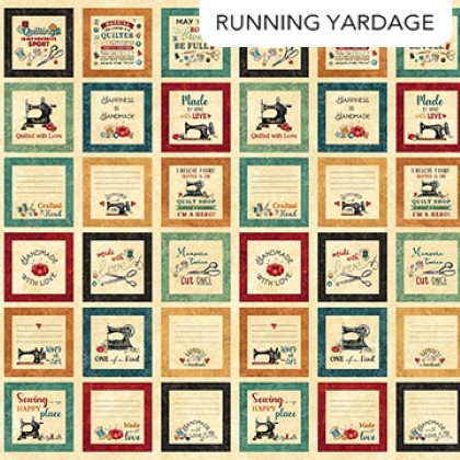 Created by Deborah Edwards in traditional Stonehenge Style, Stitchin' was crafted exclusively for quilters. In vintage style, the collection is characterized by a multi-colored Folk Art palette of Black, Red, Rust, Ochre, Cream, Green and Teal. The featured panel can be used as a centerpiece for a quilt or a wall hanging for your sewing studio or deconstructed and reconstructed into something new and creative. Additionally, the collection includes a border stripe, quilting notions, buttons, thread spools and rulers. Classic quilt patterns including hexies, and spool blocks are offered as well as running yardage blocks with quilty sayings and labels. New classic Gradation textures complete the collection in style!