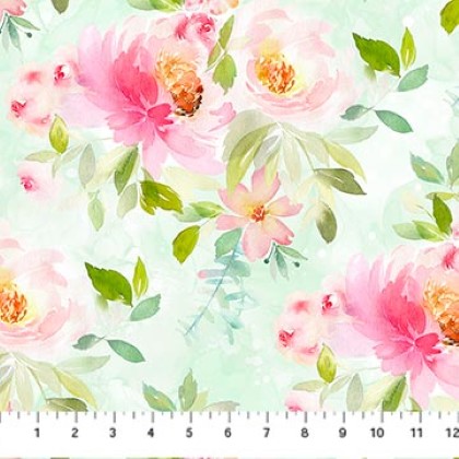 Northcott - Sweet Surrender - Large Pink Bouquet, Seafoam