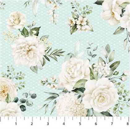 Northcott - White Wedding - Floral, Seafoam