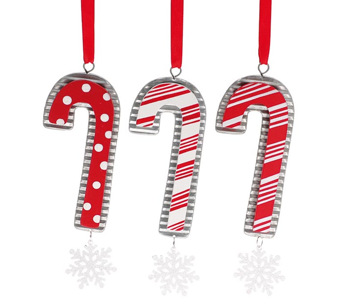 Candy cane shape wood ornaments with corrugated tin backing and red/white stripe or red with white polka dot designs. Each ornament has a dangling white snowflake at the bottom.