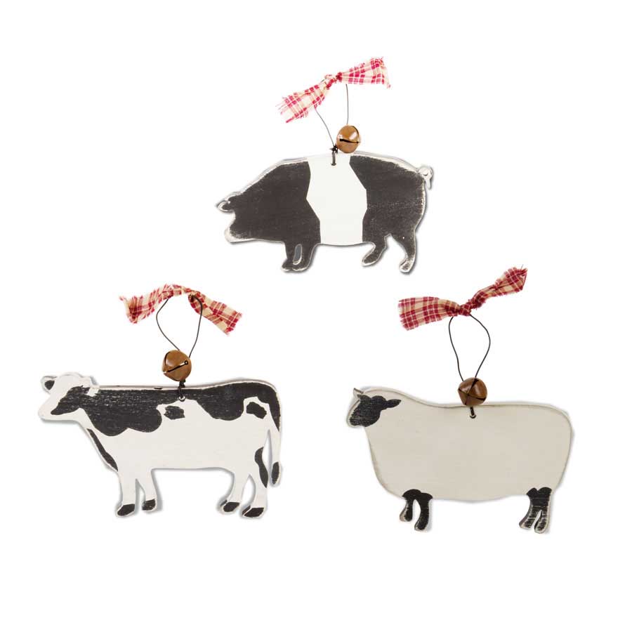 Nothing says Country Christmas quite like these charming, wooden farm animal ornaments. So cute! And with just the burgandy necktie, you can keep them around even after Christmas.