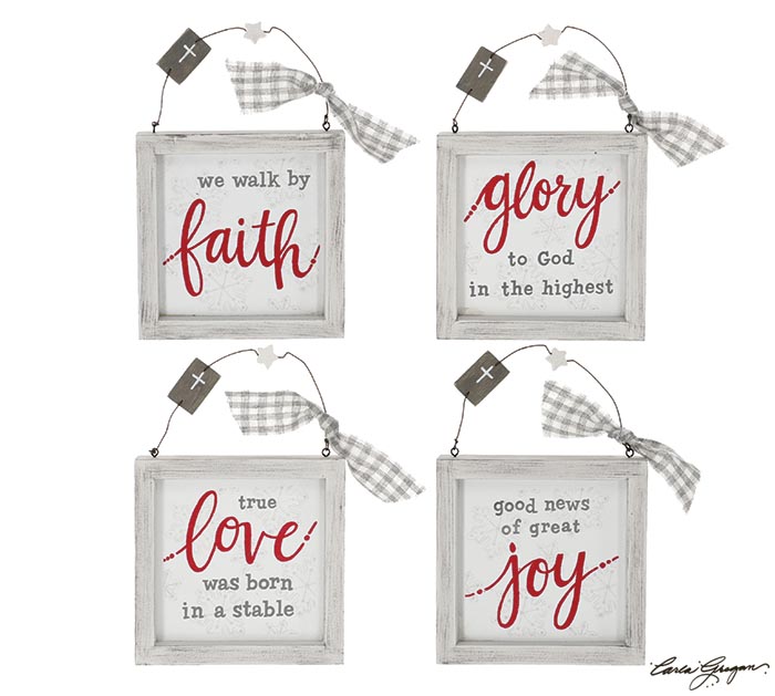 Distressed framed ornaments with red and gray assorted messages. Messages include: We Walk by Faith, Glory to God in the Highest, True Love was Born in a Stable, and Good News of Great Joy. Ornaments have a wire hanger with a cross and star bead on the hanger.