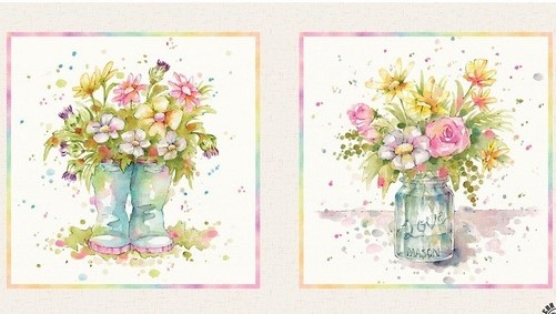 Easy-peasy summer days...one of Sally Walsh's thoughts as she was designing this enchanting, new collection. Her delightful art is highlighted in two panels...one with twelve small, rectangular blocks and the other a two-block pillow panel. There is also a beautiful double- border print that will inspire so many uses...skirts, aprons, table top, curtains, bed skirts and more. Pillow blocks are approximately 18 1/2" X 18 5/8" including 1/4" border. (2 Blocks per panel)