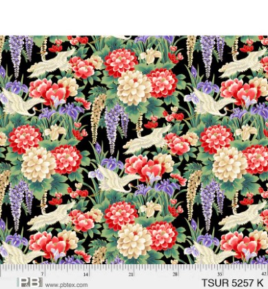 Tsuru – Japanese translation for "crane". Traditional, Asian design resonates throughout this striking fabric collection. The panel and coordinates showcase a rich, saturated color palette. Each of the lovely designs are augmented with gold, metallic accents. Imagine sewing a kimono robe with one of these prints! We're providing several, complimentary patterns for quilt projects. Be sure to check them out!