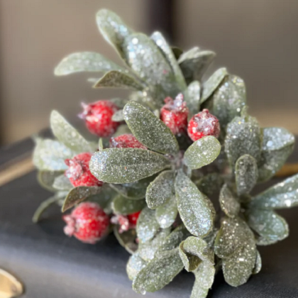 Rounded leaves in a beautiful shade of green make a gorgeous background for multi-sized red berries. Ultra fine snow and glitter add an extra dash of pizazz to this already beautiful collection.