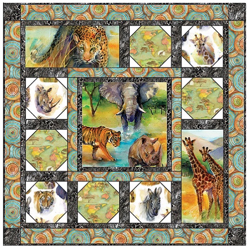 This quilt kit features the wonderment and vibrancy of the African safari. The panel in the quilt highlights the most iconic & majestic animals found there and the geometrics are inspired by African baskets.
