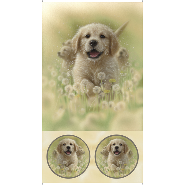 Adorable Lab puppies running in the dandelions. Create a quilt or use for pillows. Sure to delight the dog lovers in your life! Designed by Collin Bogle