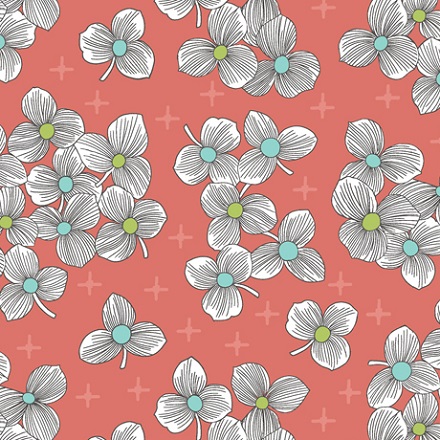 Contemporary print in fun colors. Playful florals and chevrons in aqua, coral, navy and purple. Design a quilt, create home décor or make a tote bag! Add a little color to your life!