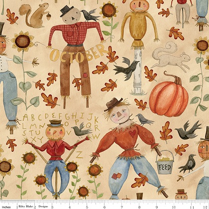 Bittersweet Farm by Teresa Kogut for Riley Blake Designs is great for quilting, apparel and home décor. This print features assorted fall icons, such as scarecrows, sunflowers, oak leaves, crows, squirrels, acorns, and more.
