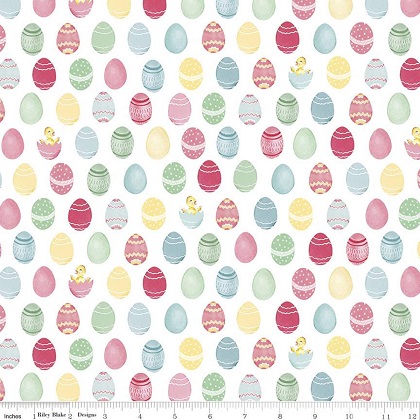 Easter Parade by Lindsay Wilkes of the Cottage Mama for Riley Blake Designs is great for quilting, apparel and home décor. This print features rows of Easter eggs with the occasional chick in a cracked egg.