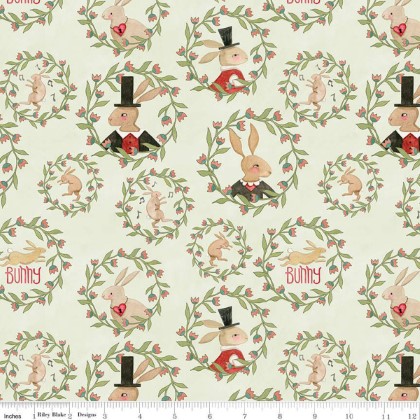 Hop Hop Hooray by Teresa Kogut for Riley Blake Designs is great for quilting, apparel and home décor. This print features floral wreaths with rabbits.