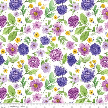 Plum Petals by Diane Labombarbe for Riley Blake Designs is great for quilting, apparel and home décor. This print features clusters of watercolor flowers.
