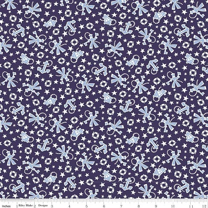 Designed by Lindsay Wilkes, this collection is great for quilting, apparel and home décor. This print features tossed anchors, lanterns, sailors, life preservers, and stars.