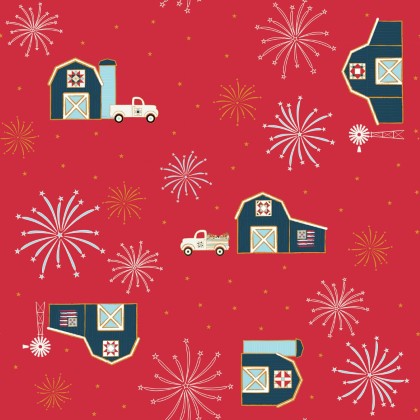 Sweet Freedom by Beverly McCullough for Riley Blake Designs is great for quilting, apparel and home décor. This print features patriotic vintage trucks and bars with stars and firework bursts and elements of gold sparkle.