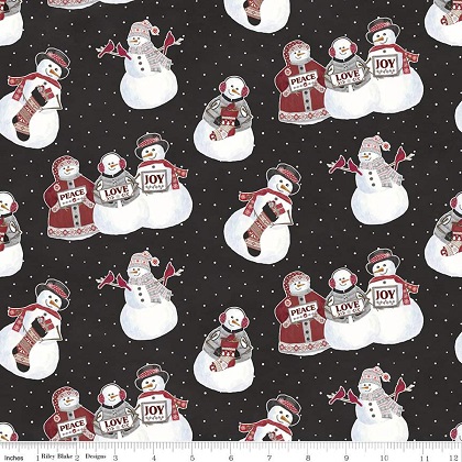 This double napped flannel from Hello Winter by Tara Reed for Riley Blake Designs is great for apparel, blankets, quilts and quilt backs. This print features snowmen holding birds, stockings, and signs that say "peace," "love," and "joy" on a pin dot background.