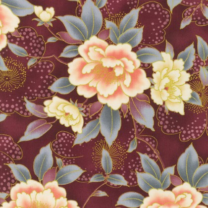 Imperial Collection Honoka by Robert Kaufman Fabrics features Asian birds, cranes, Asian flowers, cherry blossoms, Asian tiles, vines, and leafy foliage. In a selection of teals, aqua, peach, fog, cherry and mauve, highlighted by gold metallic, this Kaufman print is ideal anywhere you want to showcase a spectacular print.