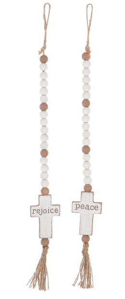 Hand-painted wooden cross with a string of white distressed and natural wood beads with crosses at the end. Messages include: Rejoice and Peace.