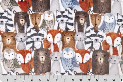 If you love our Digital Cuddle® prints, wait ‘til you get your hands on this! This exclusive Cuddle® minky plush fabric is double-sided-with a Digital Cuddle® print on one side (3mm) and a plain white backing (4mm) on the other side. Cloud Cuddle® Call of the Wild Is a charming Cuddle® print featuring some of the cutest woodland animals like raccoons, foxes, owls, cats, bears and deer. This color palette is all about the whimsical, woodsy feel, featuring caramel browns, rustic oranges, stone grays and creamy taupes. Great for pillows, quilts, blankets, animal printed loungewear, and more. This fabric is perfect for beginner sewists because it does not require a backing for the finished product, making it easier than ever to sew blankets, scarves, and beyond!