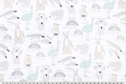 Illustrated in a kid-friendly, almost watercolor style, this simple-yet-colorful minky plush fabric will have your little one dreaming of an outback adventure as they bundle up for naptime. Featuring koalas, kangaroos, wombats, emus and more, it's also a great way to help young kids learn their Australian animals. The illustrations are dominated by soft, neutral colors, so it's a perfect complement for both little girls' and boys' rooms.