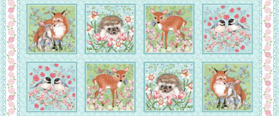 Sweet little woodland friends featuring deer, bunnies , foxes and more! All done in mid-tone pinks, blues and greens. Make a cute quilt for your little girl. Perfect for crib quilts or curtains for the nursery. Designed by Nancy Archer
