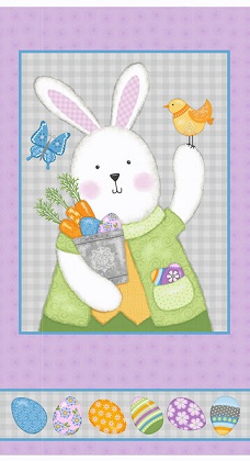Happy Spring is a collection designed for Studio E Fabrics by Sharla Fults. This collection features a 24" x 44" Joyful Bunny panel, a honeycomb patchwork design, a tossed bunny allover, a tossed butterfly print, a multicolored diagonal plaid, a tossed egg print and a colorful border stripe. The main colors used in this collection are lavender, turquoise, green and yellow.