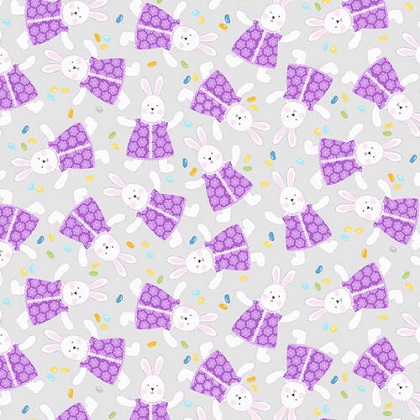 Happy Spring is a collection designed for Studio E Fabrics by Sharla Fults. This collection features a 24" x 44" Joyful Bunny panel, a honeycomb patchwork design, a tossed bunny allover, a tossed butterfly print, a multicolored diagonal plaid, a tossed egg print and a colorful border stripe. The main colors used in this collection are lavender, turquoise, green and yellow.