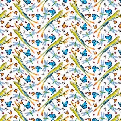 This collection, designed by Lori Anzalone, features a 24-inch frog panel, a continuous yardage block design, a frog and dragonfly allover print, a piled-up frog print, a frog and foliage design, a floral and fauna toss, a leaping frog and insect print, a tonal frog design, a small frog tossed print, a rainbow colored frog print, a patterned frog print and a reptile skin texture.