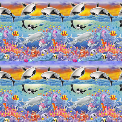 Studio E - Sea World - Sea Creature Border Stripe, Multi/Aqua