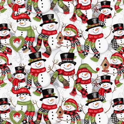 This new winter collection by Sharla Fults includes a 24" x 44" panel that features a jolly snowman. There is a border stripe ideal for a row quilt or bordering effects. Other patterns included in the collection are a tossed and a packed snowman, a buffalo plaid, a swirl texture design and versatile black and white dots.